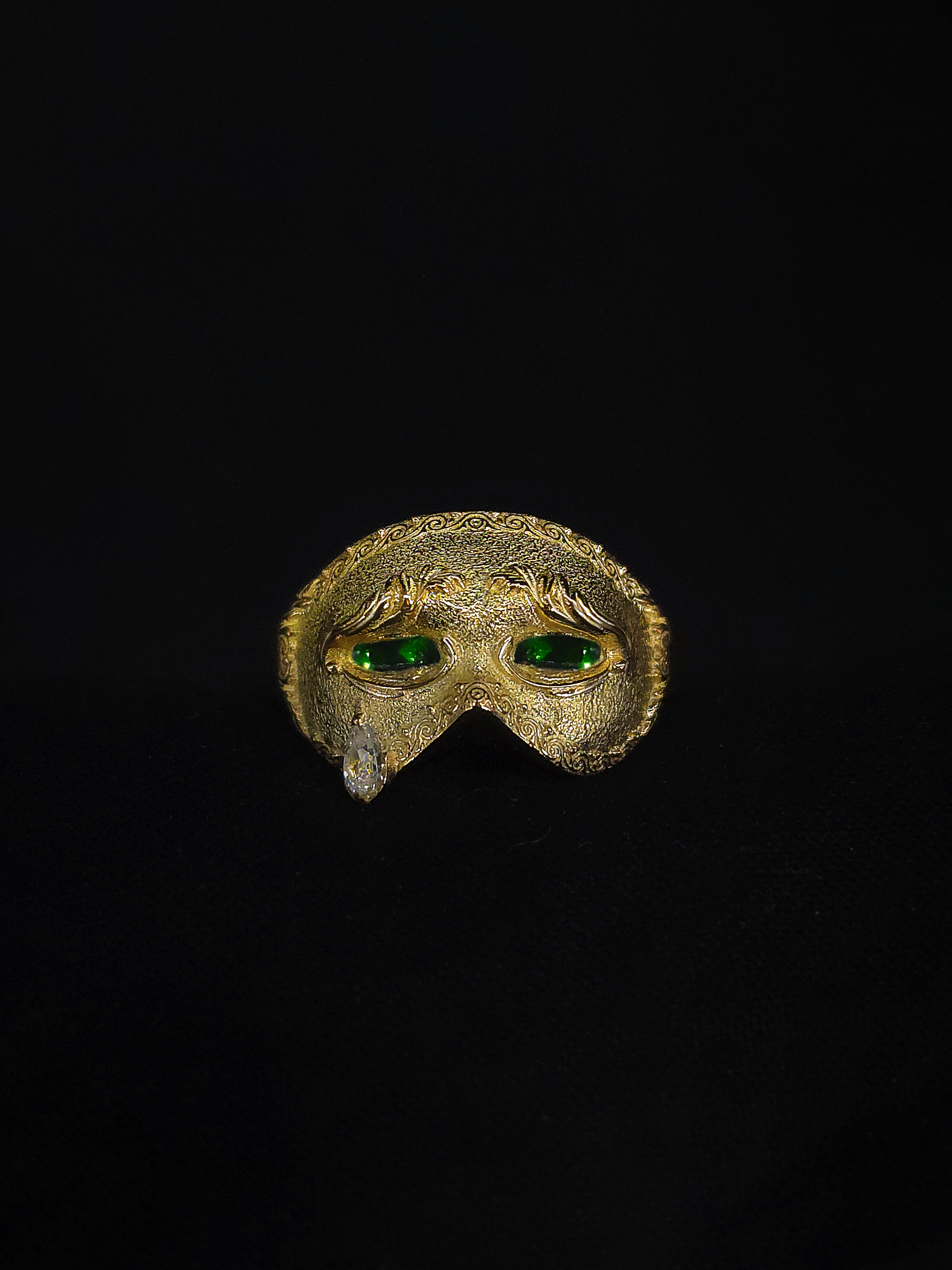 Crainte is a surrealist statement ring that captures the drama of masked identity and mechanical beauty. Drawing inspiration from the ceremonial masks of the Venetian Carnival, the ring features a sculptural face veiled in stillness; until you move.