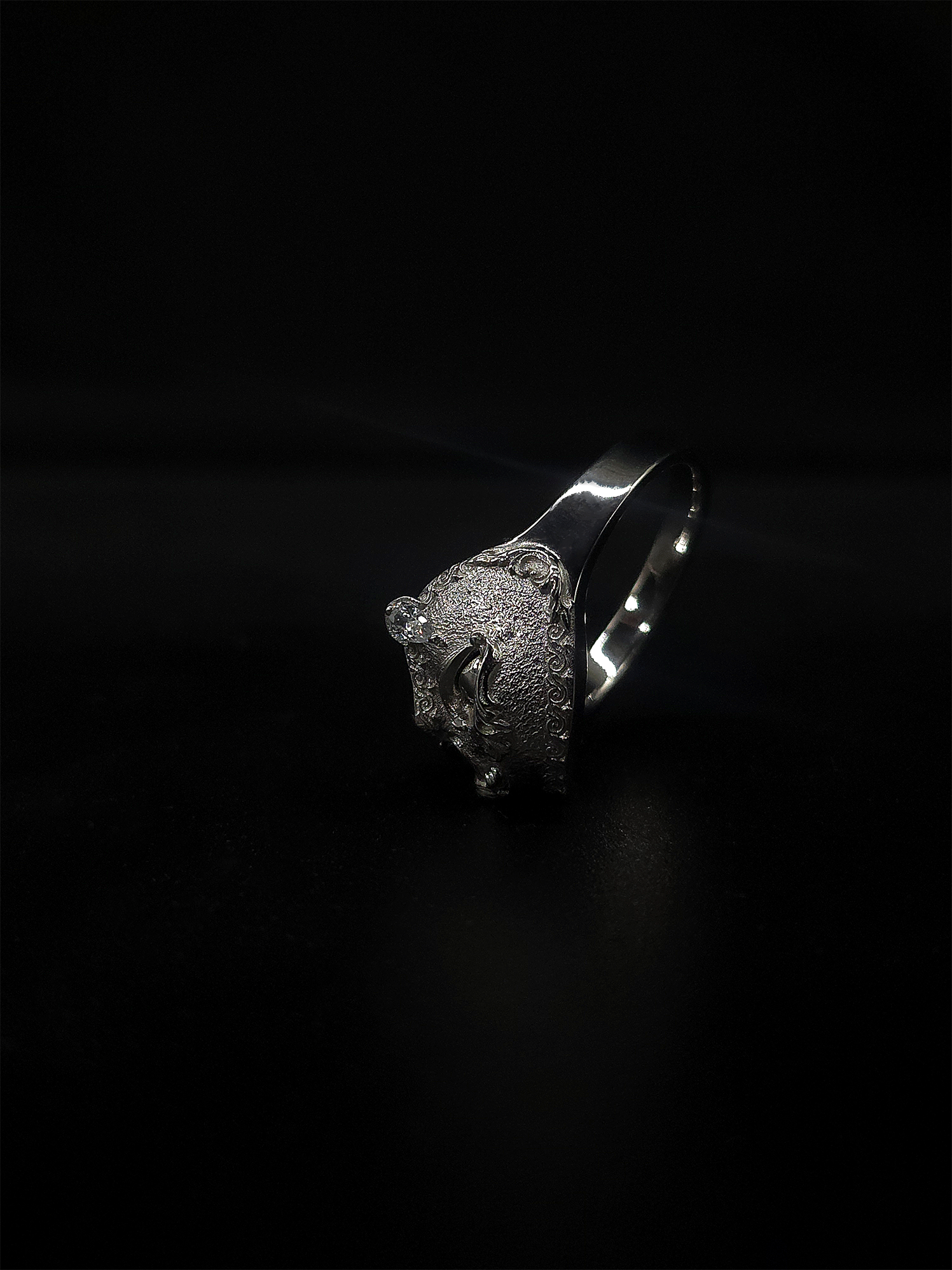 Crainte is a surrealist statement ring that captures the drama of masked identity and mechanical beauty. Drawing inspiration from the ceremonial masks of the Venetian Carnival, the ring features a sculptural face veiled in stillness; until you move.