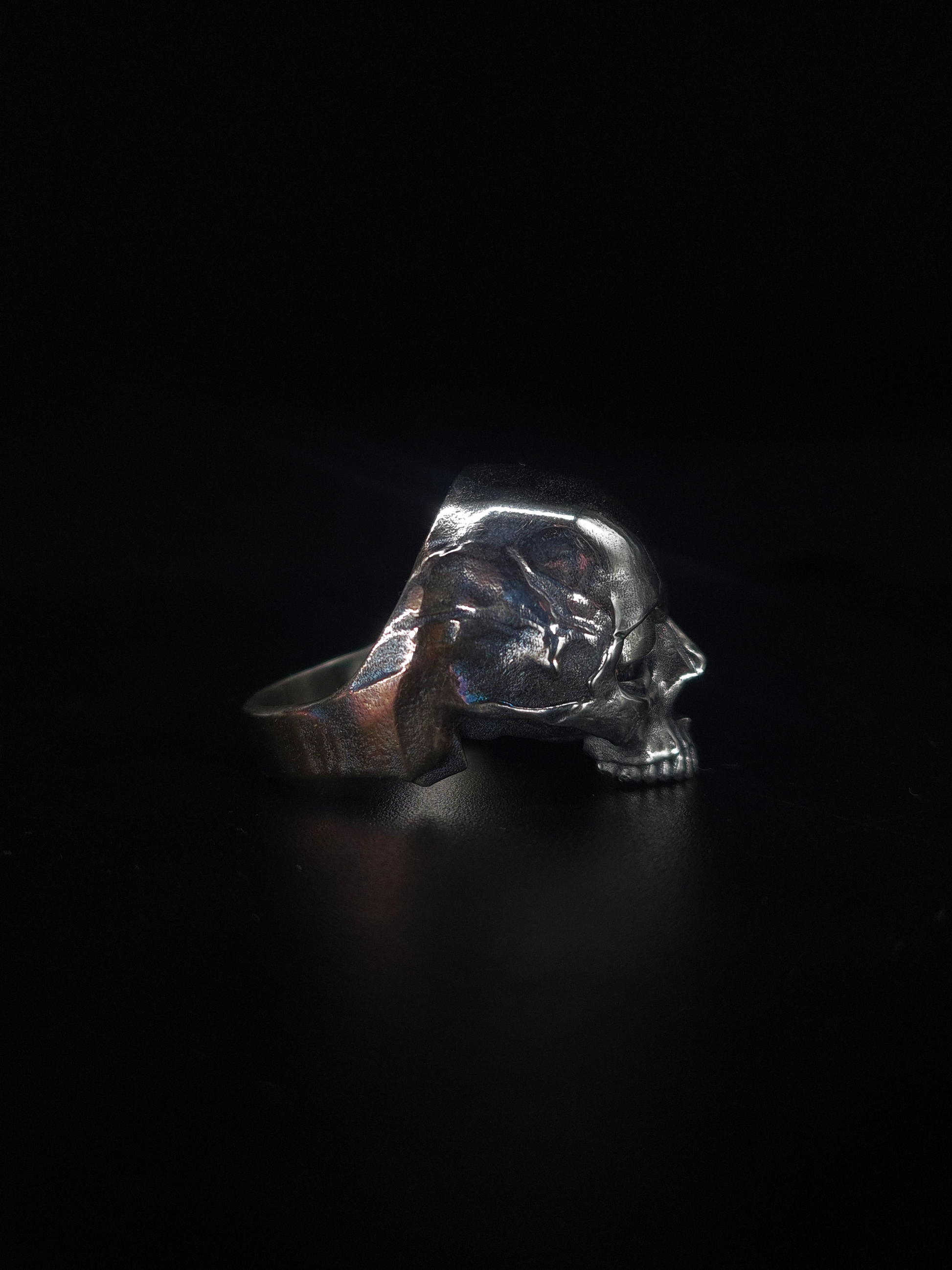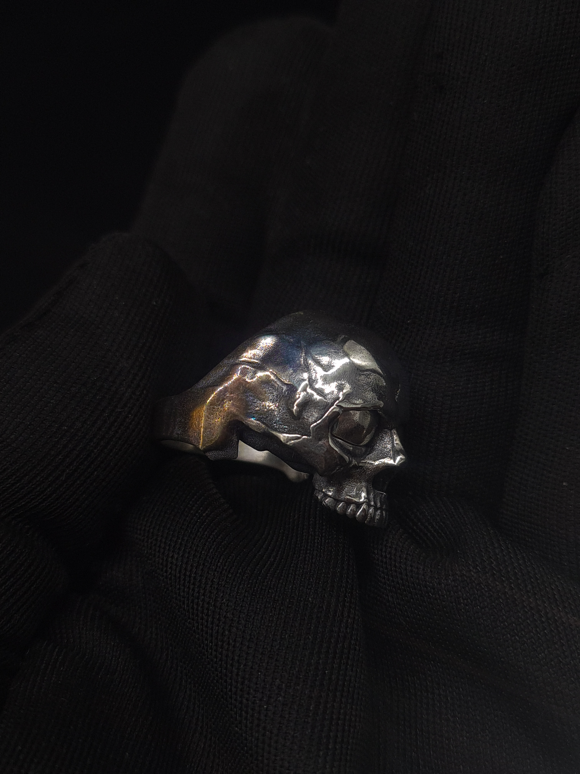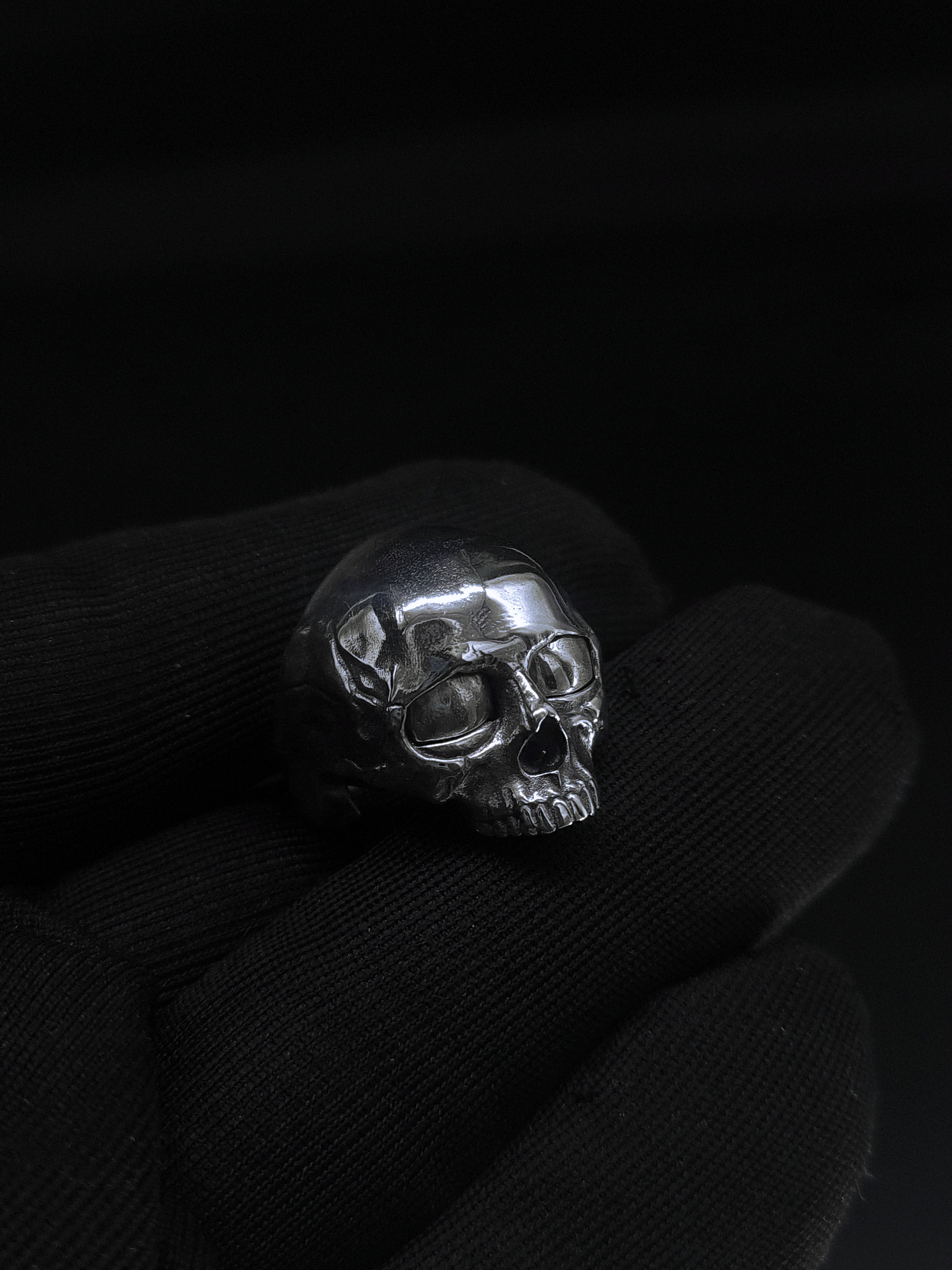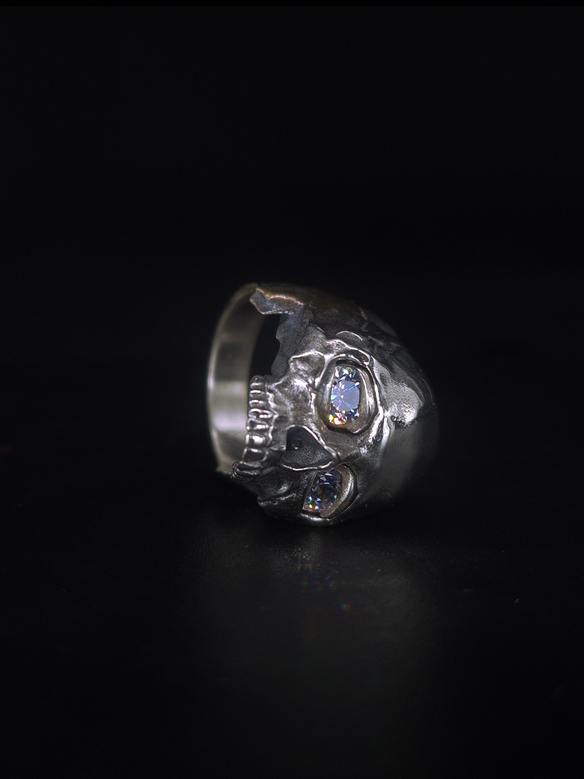 The Lenore Half-Jaw is crafted from high-quality .925 Sterling Silver. This ring features 5mm white brilliant crystal eyes set within the skull, with eyelids that captivatingly open and close with movement. The silver is artfully treated with an iridescent patina that gradients from the back to the sides of the skull, while the front is high-polished for a distinctive finish.