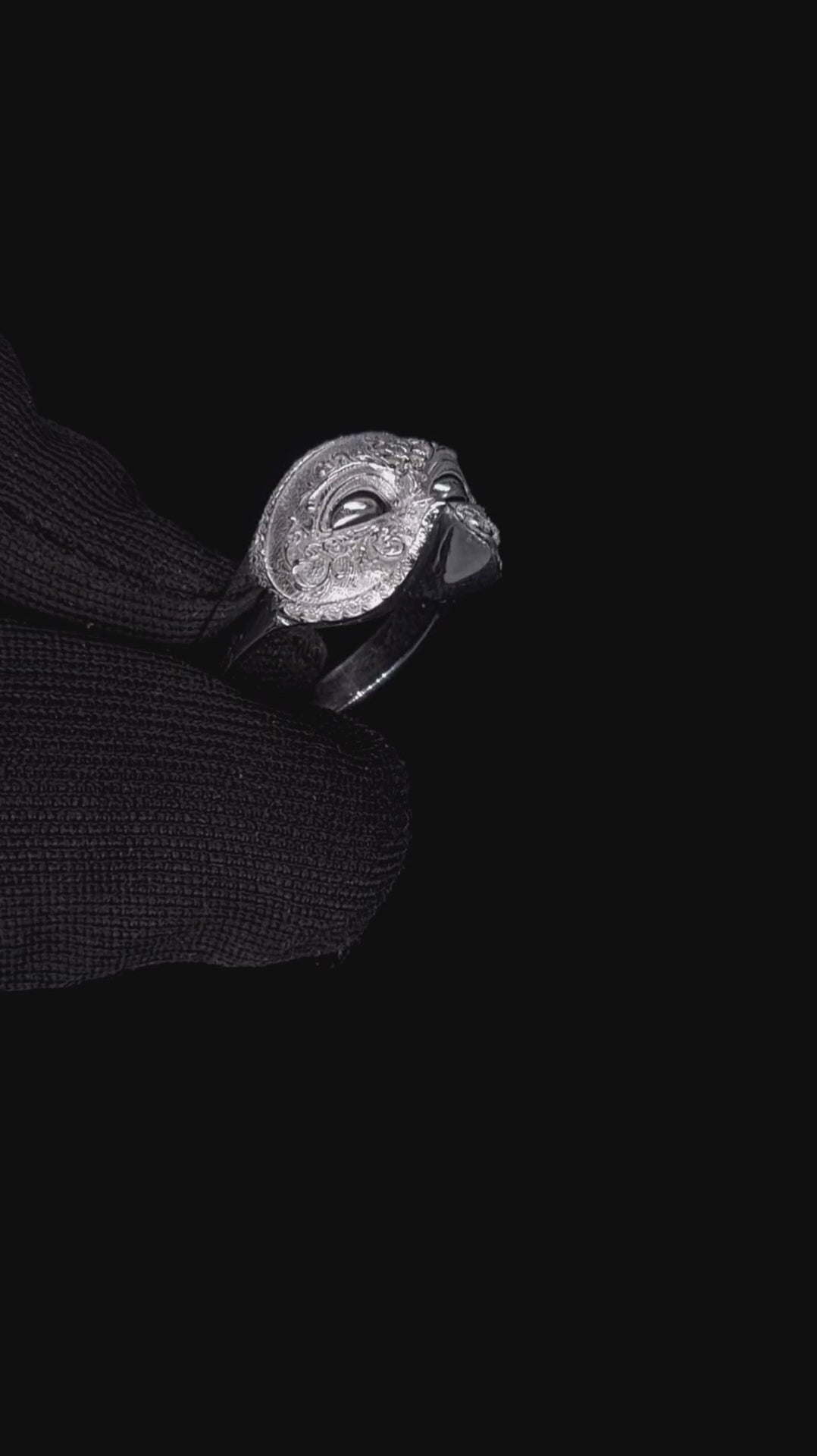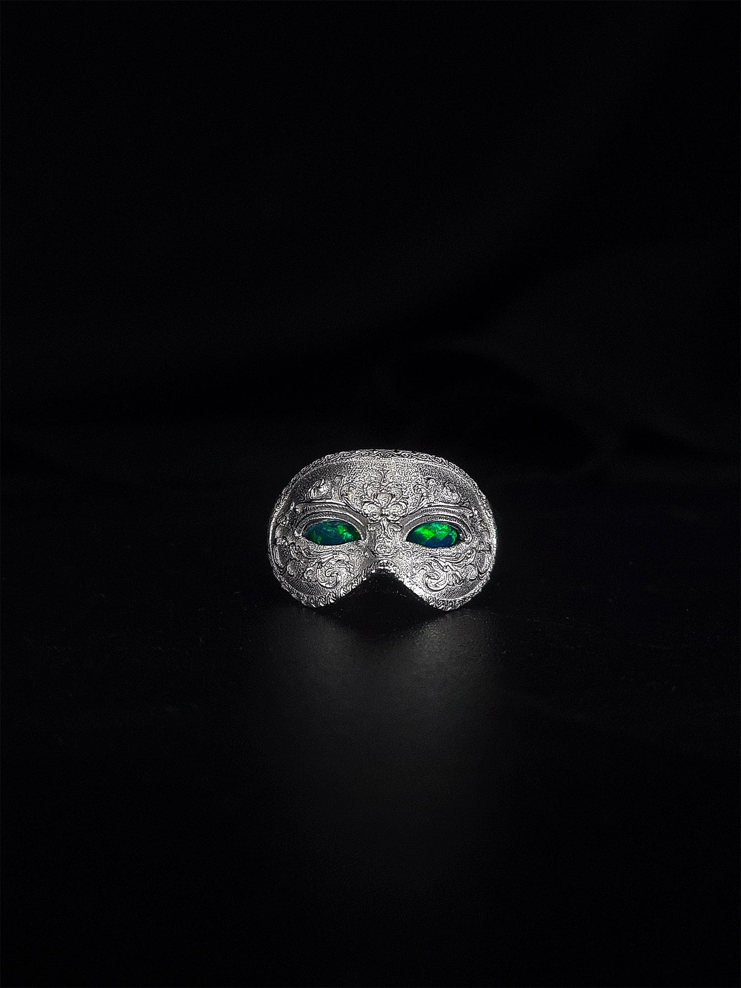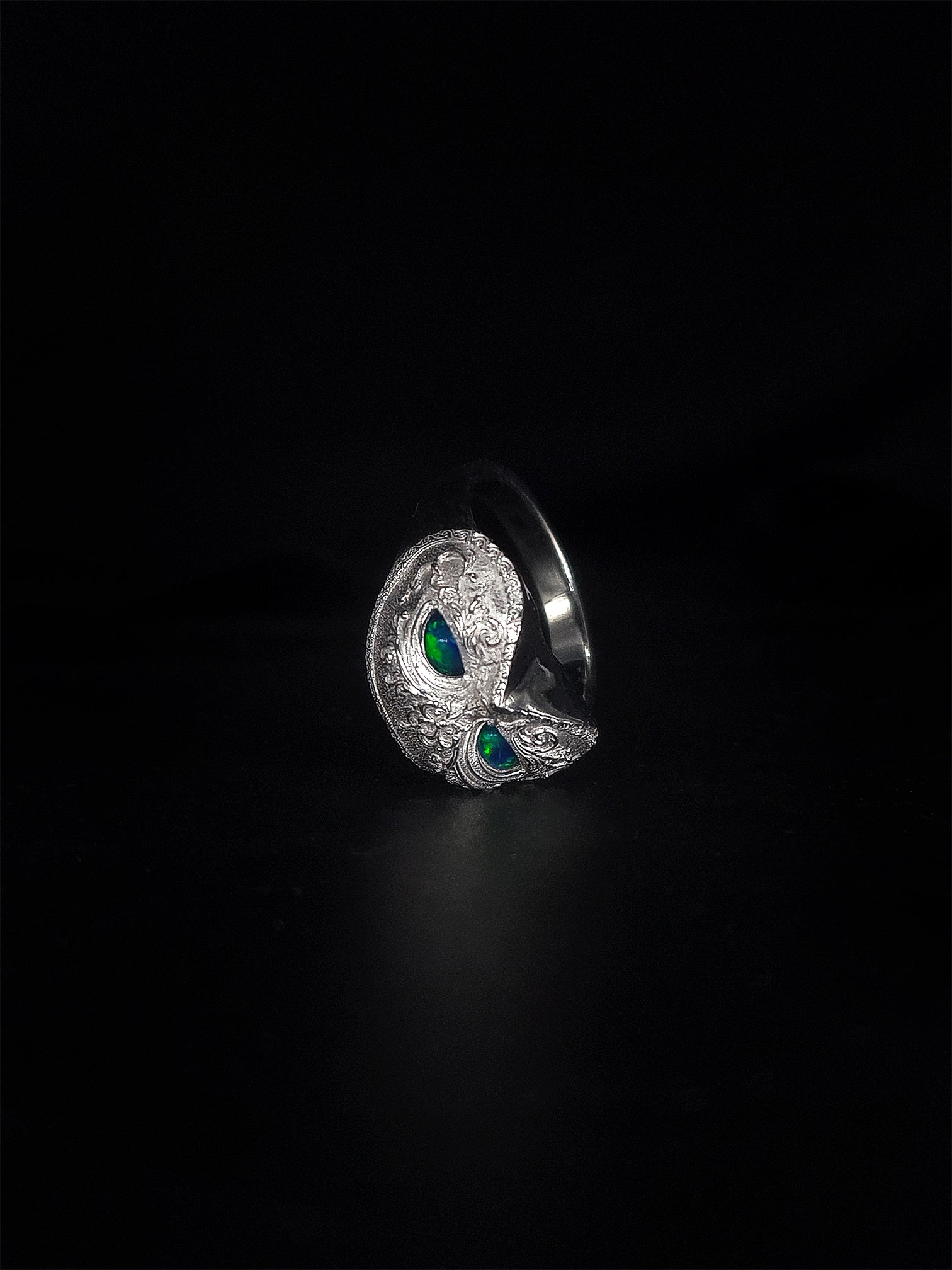 Inspired by the mysterious masks of the Venetian Carnival, Los Ocultos is a handcrafted statement ring that merges historical elegance with modern craftsmanship. Meticulously made from high-quality 925 sterling silver and plated in Rhodium, this baroque-style ring features a sculptural face framed by intricate eyelid mechanisms—My most advanced kinetic movement yet. The eyes are set with 4mm opals, lending an intensity to its gaze.