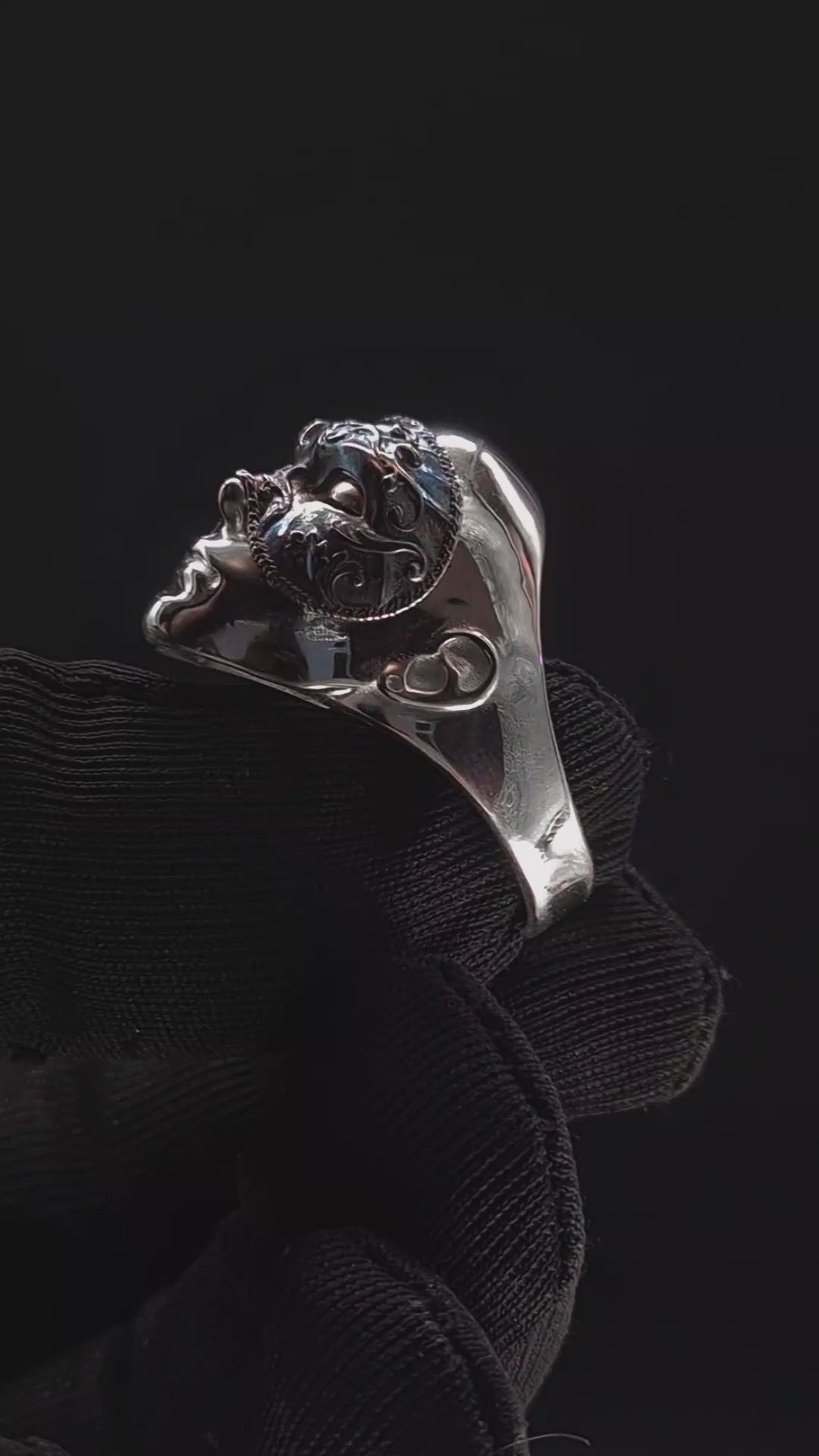 The Masque 2090 XGC ring, inspired by the masks worn delicately by the prosperous class at 16th century balls, features a mirror-polished face adorned with a unique rainbow-glazed patina masquerade mask, intricately fashioned from high-quality .925 Sterling Silver. Its visage is embellished with captivating 3mm opal eyes. Notably, the eyelids exhibit an enchanting motion, gracefully opening and closing with each movement