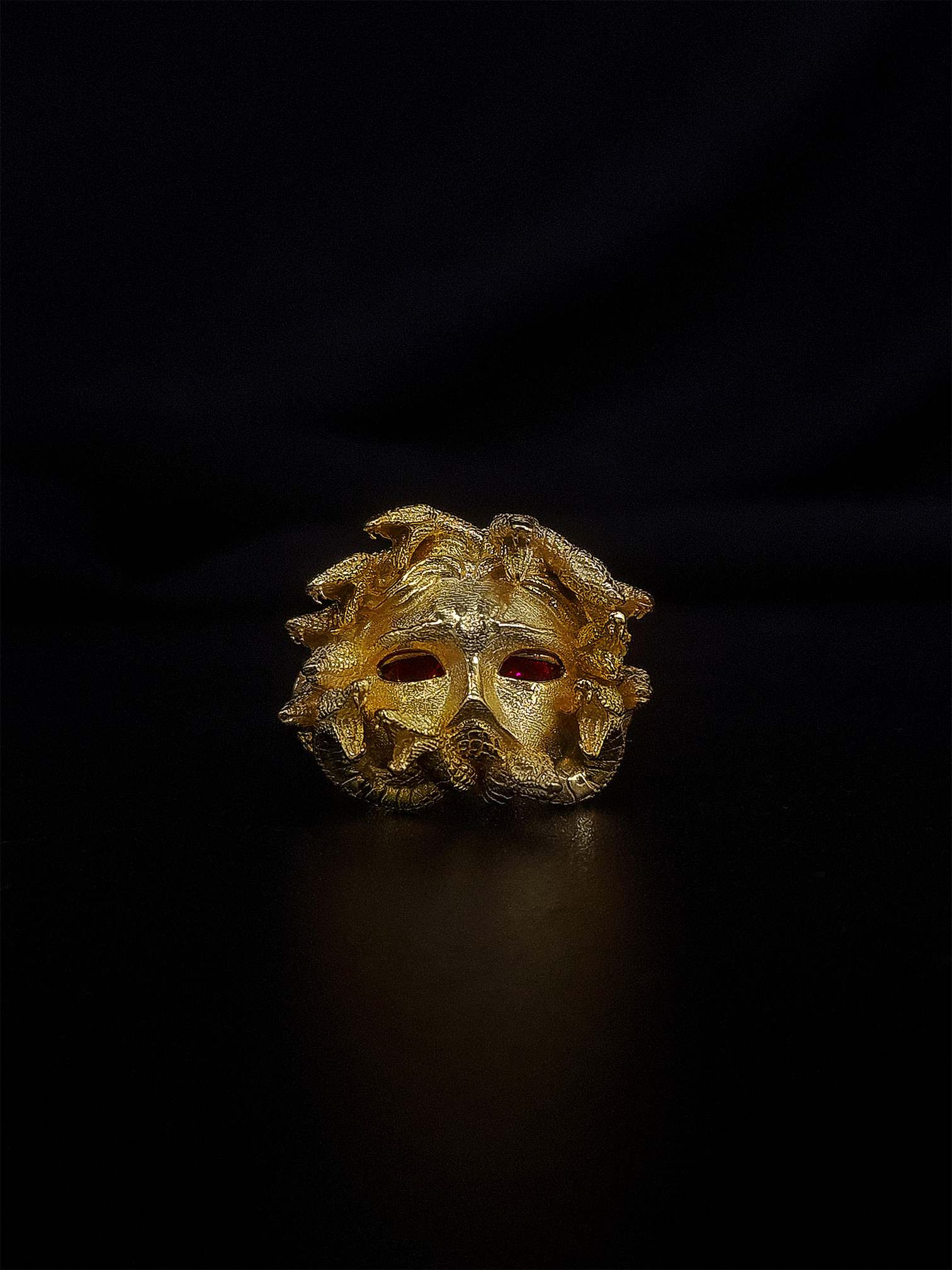 Striking interpretation of myth and movement, the Medusa ring is meticulously handcrafted from solid 925 sterling silver and finished in rich 18k gold plating. At its centre, Medusa’s face emerges from a crown of intricately sculpted serpents, each detail echoing her allure. Medusa's gaze is brought to life with 3.25mm crystal-set eyes, while the kinetic eyelids - engineered with our most advanced mechanism to date, open and close with the motion of the wearer, revealing a haunting elegance.