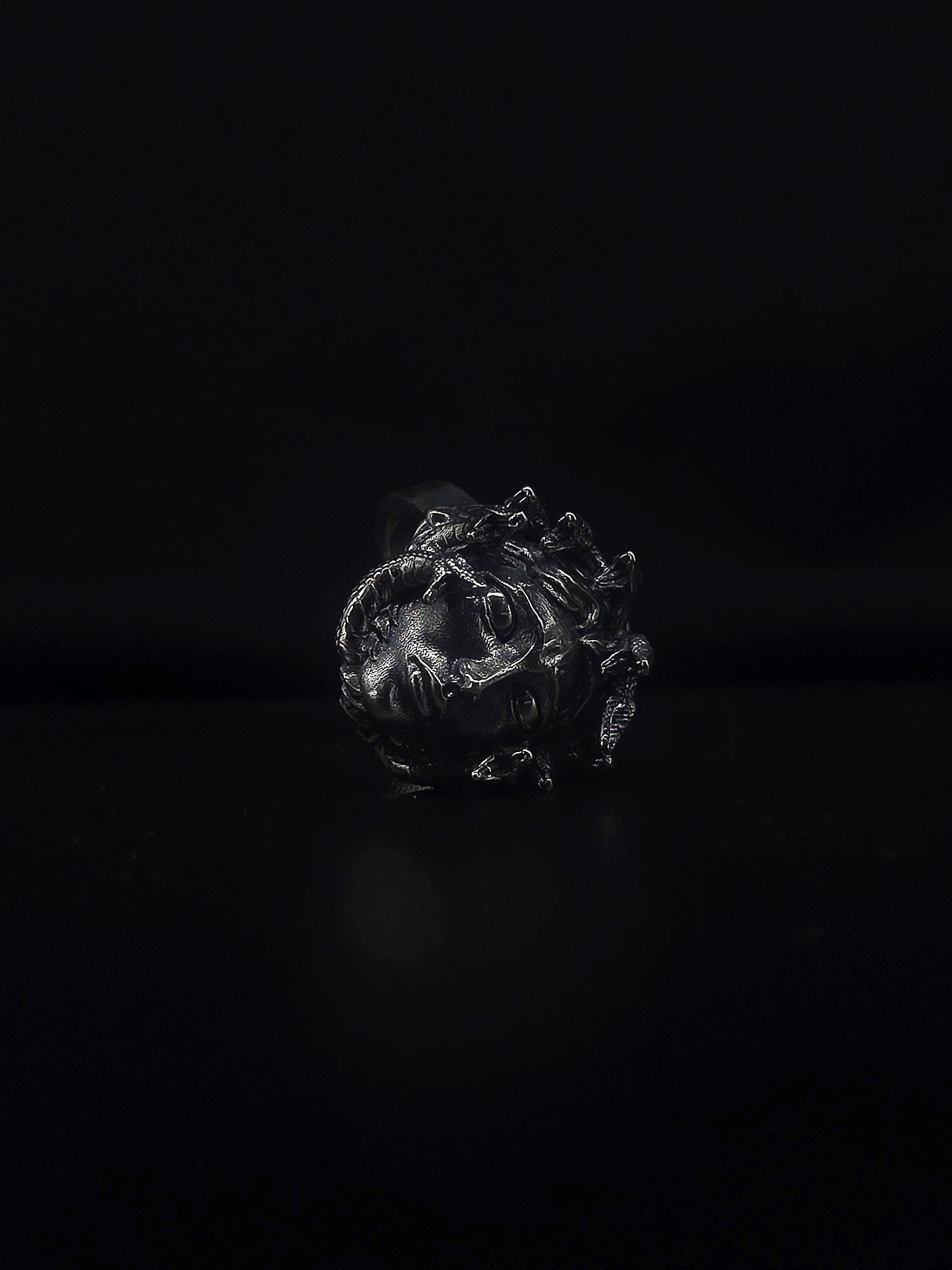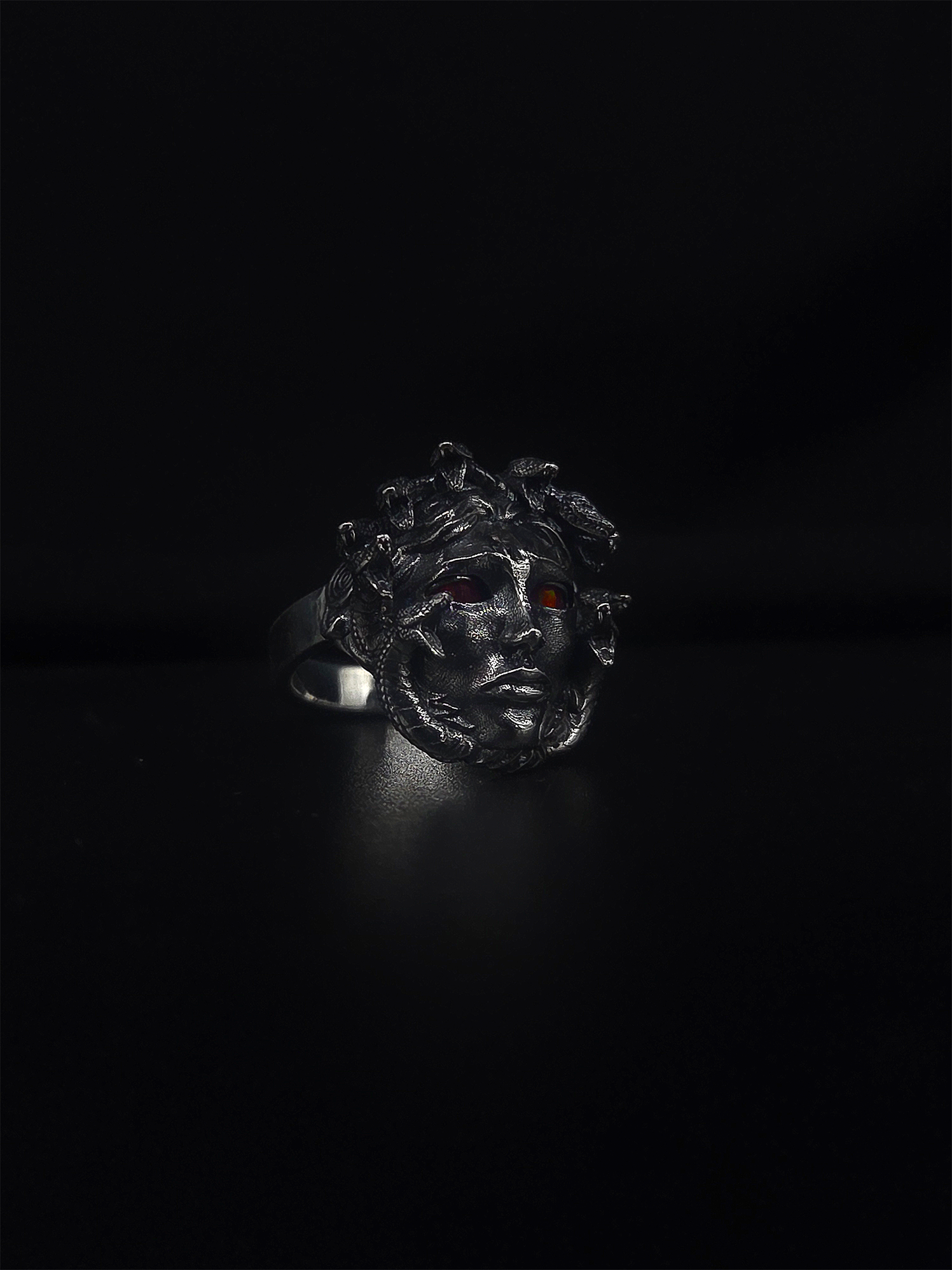 A bold fusion of mythology, movement, and craftsmanship, the Medusa Ring is a wearable sculpture that commands attention. Crafted from solid 925 sterling silver and with a blackened treatment, this statement ring captures the haunting beauty of Medusa, the mythic symbol of power, transformation, and rage.